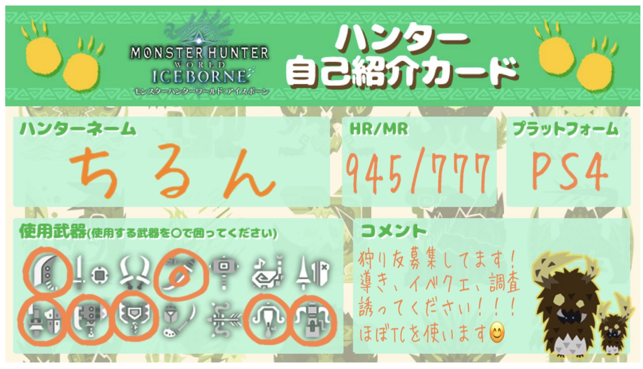 ちるん V4 ミリア1 On Twitter Mr777記念に更新 ᐛ و 次はhrカンストの時更新かな あとどこかサークル拾って 笑 Tcor聞き専でいい所で Rtお願いします モンハン募集 Mhwi Mhwib Mhwibフレンド募集 Mhwibサークル募集 Mhwib自己紹介カード