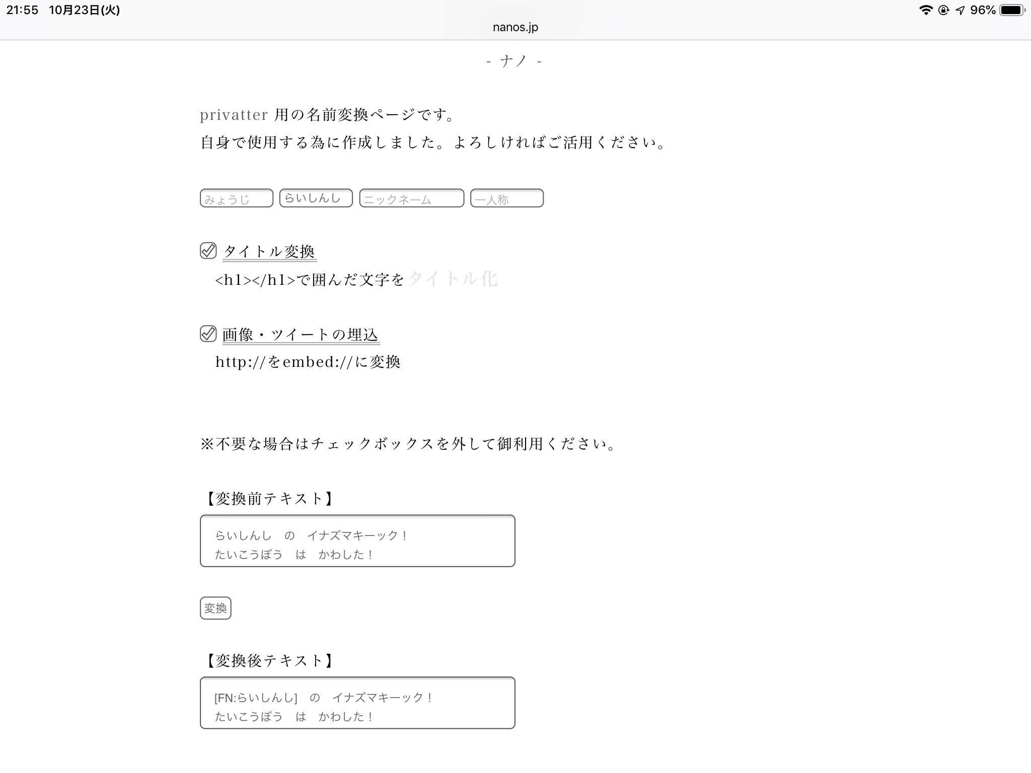 ぷらいべったー On Twitter 杳鳥 はとり 様が作られた ぷらいべったーの夢小説投稿に便利な変換ツールを紹介いたします ページ上部のフォーム に変換したい名前を入力し 変換前テキスト に本文を入力すると 変換後テキスト のところに指定した名前に名前変換タグ